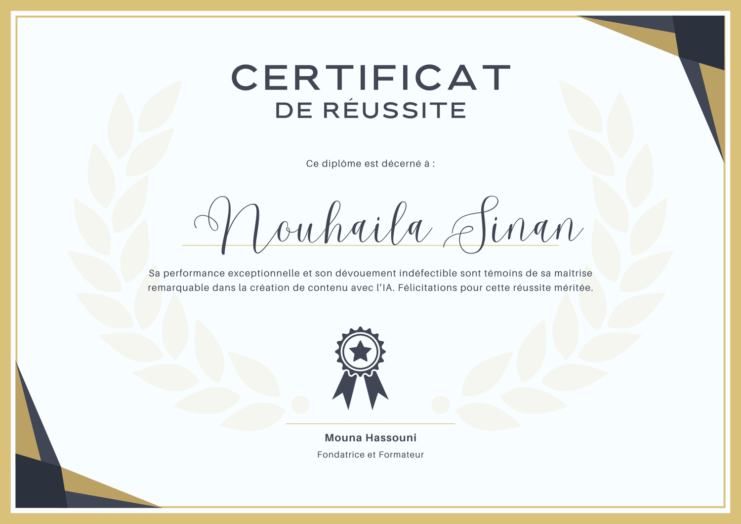 Une fois la formation terminée, tu recevras un certificat de réussite signé Mona Digital Business, qui atteste de ta maîtrise de la création de contenu avec l’intelligence artificielle.